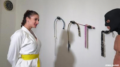 Sexy and sadistic Miss Dula, today she is wearing a beautiful karate kimono. She called her slave Enea under the guise of practicing some martial art moves, but in reality it's just an excuse because she loves kicking him in the balls.